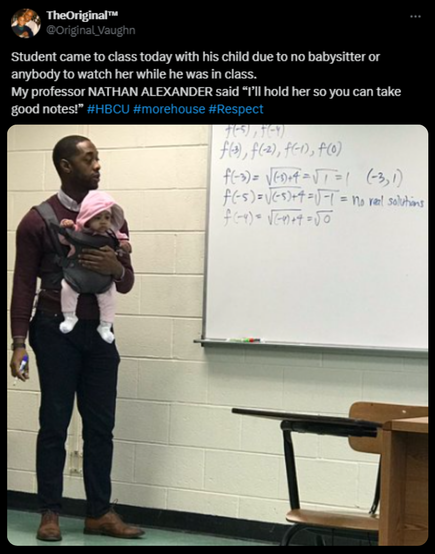 A viral moment at Atlanta’s Morehouse College brought home the plight of student-parents when a professor strapped a student’s baby to his own chest during a class so the student could focus on learning. The nation’s only historically Black, 4-year liberal-arts college for men, Morehouse has since launched “Fathers to the Finish Line” — an initiative to help student-fathers complete their degrees, recognizing that Black fathers drop out at the highest rates of any other student-parent group.